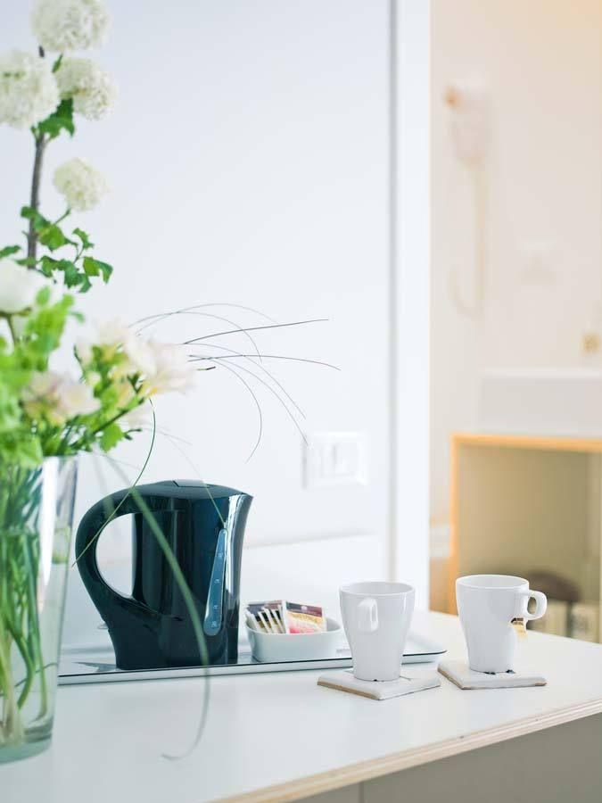 - Macchina per il caffè espresso e bollitore con selezione di tè, caffè, biscotti e acqua in bottiglia;